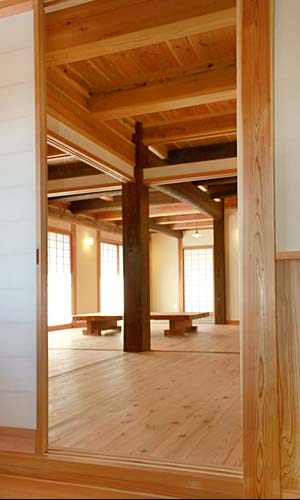 交差するリビングの屋根には、世界で唯一つの木組み